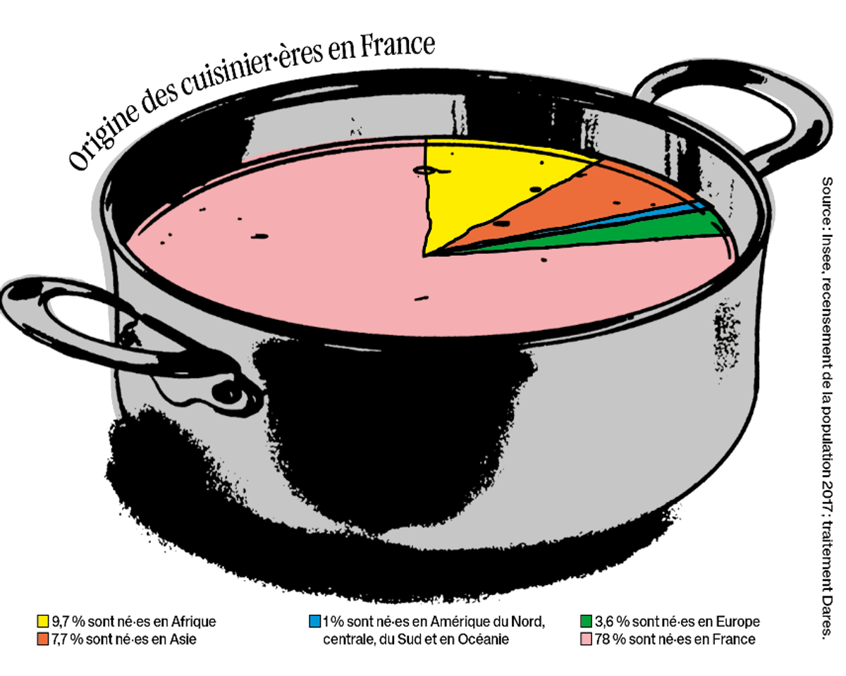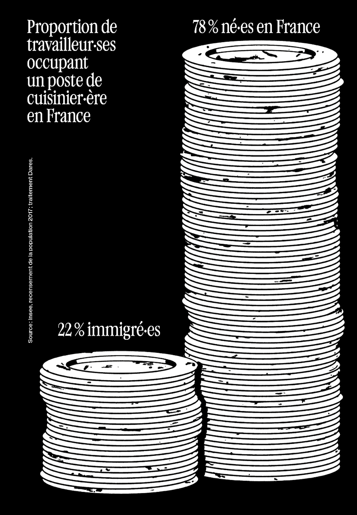 En France, 22 % des postes de cuisinier et près d’un cinquième de ceux d’agent de maîtrise de l’hôtellerie-restauration sont occupés par des travailleurs étrangers, pour la plupart des hommes, selon les dernières études de l’Insee et de la Dares**. C’est sans compter la part indiscernable de sans-papiers dans le métier. À rebours des profils de « profiteurs » du système social que certains partis politiques cherchent à leur coller à la peau, c’est dans les coulisses de l’économie qu’ils opèrent, relégués aux tâches boudées par la plupart des Français·es « de souche ». Arrivé au terme d’un parcours migratoire long de plusieurs années, Maki hausse les épaules quand on évoque l’aide médicale d’État ou la CAF : il n’est pas là pour grappiller. « J’ai fait le chemin pour travailler et gagner de quoi envoyer à ma femme et ma fille, qui sont restées au Sénégal. » Dans la cuisine qu’il vient d’intégrer, trois autres étrangers (un Nigérian et deux Ivoriens) s’échinent pour le même maigre pactole : 1 000 euros par mois, dont une grosse part s’envole vers leurs distants foyers. Les Blancs ? « Jamais vu à la plonge. » Sauf une fois, quand il était encore à Paris : « Le gars a tenu 48 heures. »