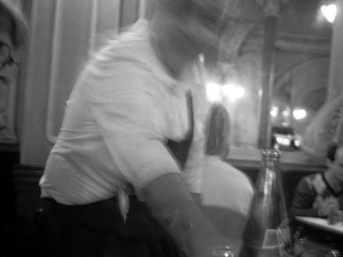 « Le serveur, sa personnalité, son style vestimentaire, sa connaissance des vins, son franc-parler… tout ça fait désormais l’attractivité du restaurant. On ne va plus quelque part uniquement pour le lieu, on y va aussi pour ceux qui le font », affirme Julia. À La Renaissance, à L’Orillon, à Limmat ou chez Paloma, le ballet s’est modernisé : les artistes de la salle sont en Dickies et Salomon XA Pro, foulard noué autour du cou ou en guise de couvre-chef, tatouages dévoilés. Autrefois droits comme des piquets, les garçons de café (qui sont tout autant des « filles de café ») s’affichent souples, décontractés, prêts à (littéralement) balancer les assiettes à saucer. Elvire, devant la porte close du Bouillon Julien, après son service, confie que pour son prochain boulot en salle, elle aussi aimerait expérimenter un peu plus le contact client. Quant à continuer de porter un uniforme du passé ? Celle qui préfère porter un Levi’s noir plutôt qu’un pantalon droit sous son tablier ironise : « Au moins, ce ne sont pas mes fringues que je tache ! »
