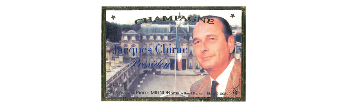 Bien que Jacques Chirac préférait la bière au vin (la lager mexicaine particulièrement), la grandeur de sa nouvelle fonction de président des Français·es se devait d’être incarnée par leur breuvage favori. On sait qu’en 1995, il fit mettre sa ganache de vainqueur sur des étiquettes de champagne. On sait moins qu’il eut aussi sa cuvée de gewurztraminer – dont il reste un magnum à vendre en ligne, si ça intéresse quelqu’un.