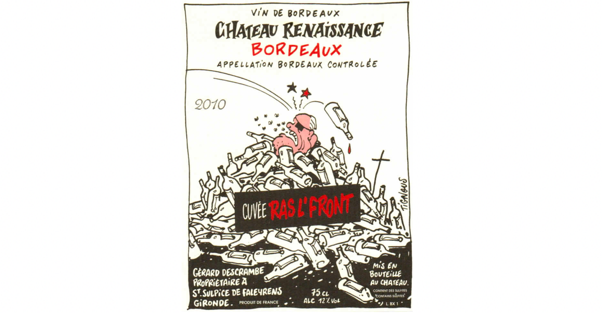 Allô Marine bobo ? C’est un Jean-Marie pas beau qui s’étale cette fois sur l’étiquette bédéiste du regretté Tignous, dessinateur à Charlie Hebdo. Un moyen pour le réseau d’extrême gauche Ras l’front, avec le concours du vigneron Gérard Descrambe, de répondre à la captation de l’imaginaire du vin par la droite ultra-conservatrice. Un rouge bordelais embouteillé en 2010 comme autant de fantasmes d’objets contondants jetés à la face de l’opposition.