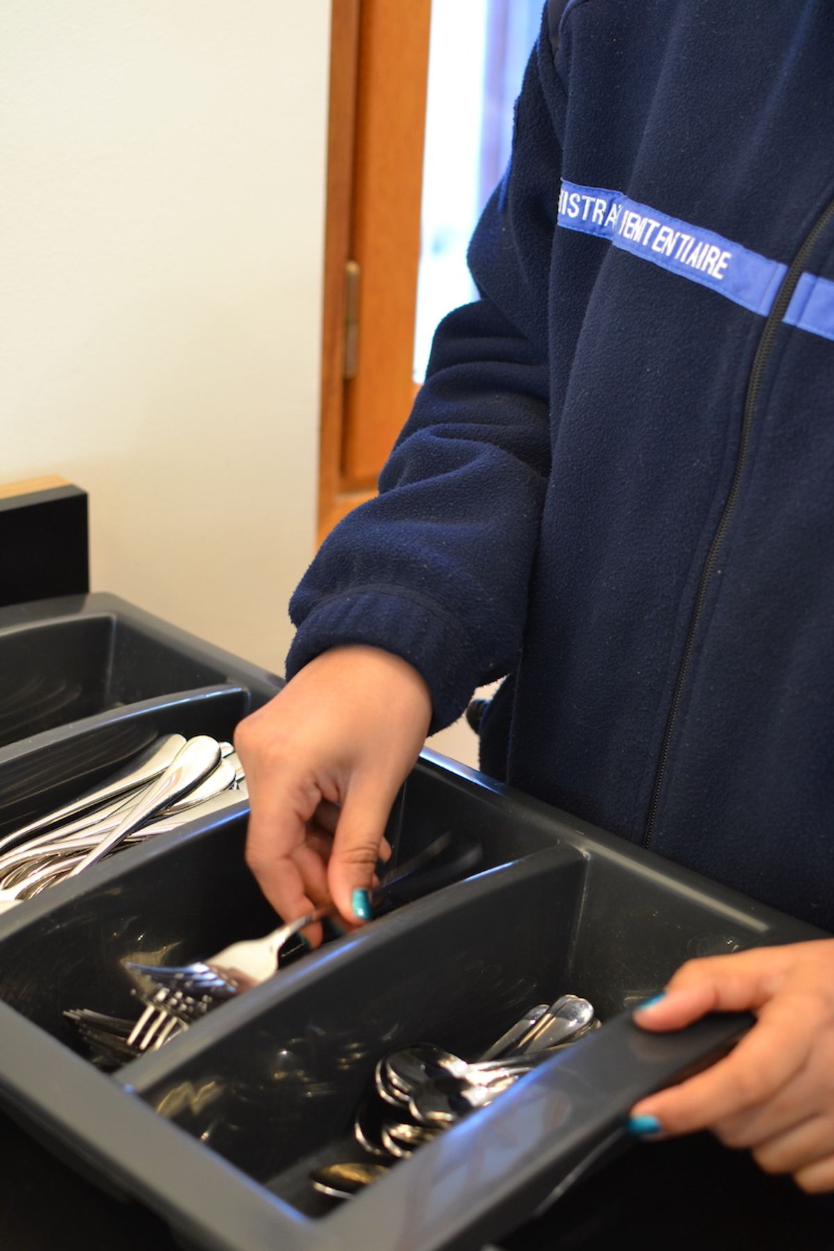 Cliquetis des jeux de clés. Ouverture, fermeture – il est un peu plus de huit heures. Les détenus, nommés « opérateurs » dès lors qu’ils franchissent le seuil du restaurant à l’étage du bâtiment situé face à la cour d’honneur, se changent en arrivant, escortés par la surveillante qu’ils s’amusent à surnommer Dora l’exploratrice – la faute à son sac-à-dos. On enfile une chemise blanche, on boutonne une veste de cuisine, on noue un tablier. Des gestes banals pour la profession, une petite révolution en prison.