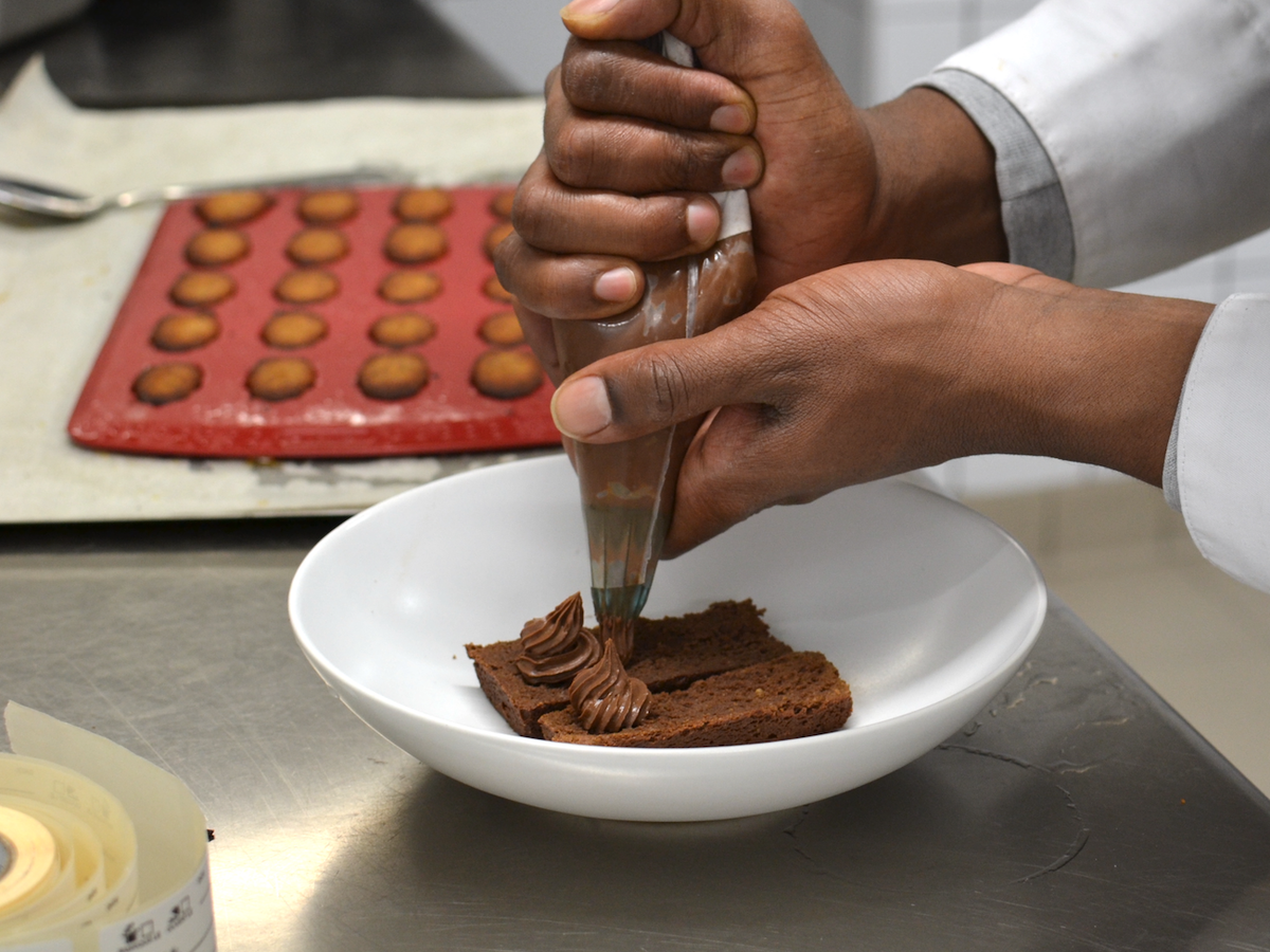 « C’est mon premier mois en tant que serveur », témoigne Ahmed, trentenaire barbu, qui ajoute en se marrant : « C’est aussi la première fois que je donne une interview ! » Comme lui, la majorité des autres détenus n’avaient jamais mis les pieds dans une cuisine professionnelle avant Les Beaux Mets. La cheffe Sandrine Sollier, une « externe » formée chez Gérald Passédat au Petit Nice, reconnaît : « Ce n’est pas facile de commencer de zéro, dans les conditions de la prison. Mais on s’adapte, et c’est ce challenge qui me plaît aussi. » Patiemment, elle leur montre aujourd’hui comment manier la poche à douille pour le dressage des desserts, ou comment vérifier la cuisson du maquereau.