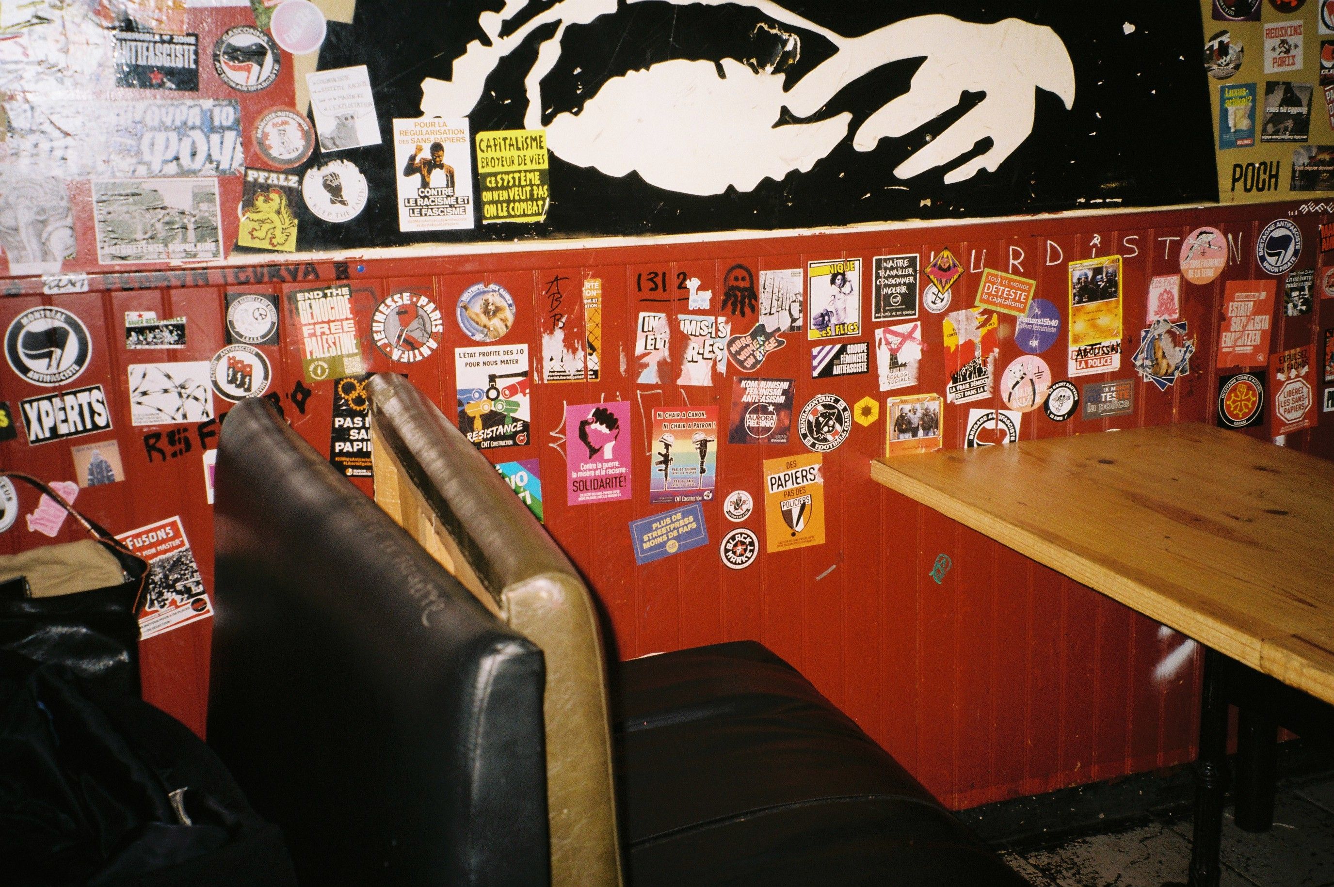 Loin de l’esthétique symétrique andersonienne, on reconnaît le café politique à son amoncellement de stickers bariolés, tracts de partis et programmes de soirées placardés. Mais dans l’imaginaire collectif, le « rade militant » est aussi décoré d’un florilège d’hommes gueulards ou du moins bavards, tenant le crachoir. « Le café politique, c’est une affaire d’hommes déchus, d’ouvriers renvoyés… C’est le premier syndic’, finalement ! » dépeint Sylvie Aprile, professeure d’histoire contemporaine à l’université Paris-Nanterre, spécialisée dans les révolutions des XIXe et XXe siècles en France. Le Café Dumay, un modèle du genre ouvert en 1868, haut lieu de révoltes et de revendications salariales, a par exemple été fondé par Jean-Baptiste Dumay, un employé remercié par les usines du Creusot, en Saône-et-Loire. « Jusque dans les années 60, les seules femmes présentes dans ces cafés révolutionnaires aidaient à la logistique de l’établissement », note l’experte.