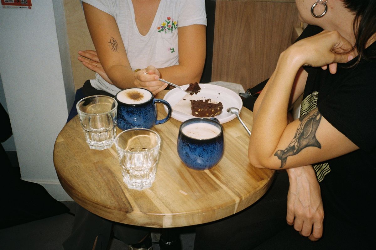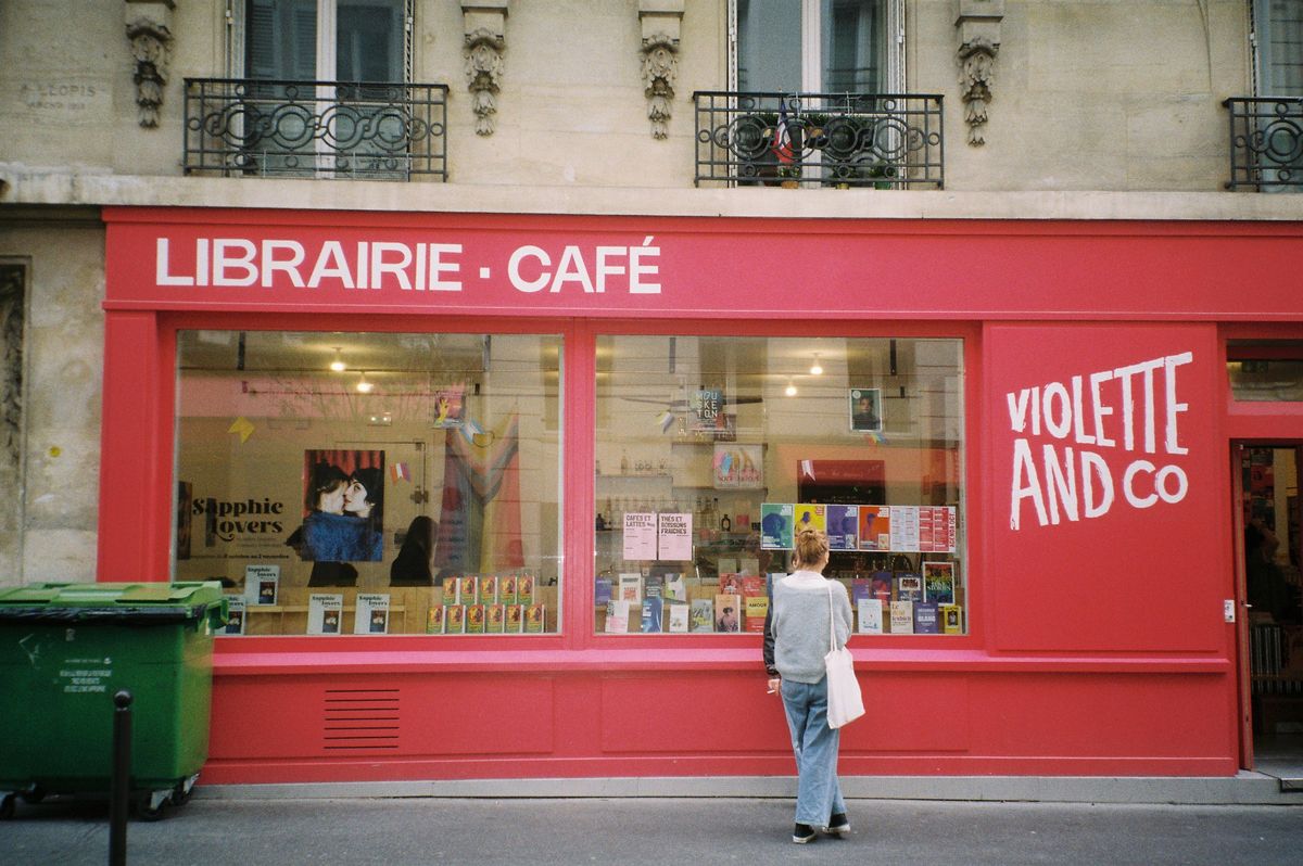 Quand Olivia Sanchez a repris la librairie parisienne LGBTQ+ Violette and Co il y a un an, avec cinq autres camarades, elle avait au moins une certitude : « Proposer un espace café, c’était nécessaire. » D’abord plantée rue de Charonne depuis 2004, l’une des librairies phares de la communauté queer et lesbienne, alors tenue par Catherine Florian et Christine Lemoine, a fédéré pendant dix-huit ans une clientèle de quartier autour d’une sélection pointue et d’interventions de figures du féminisme contemporain, de Virginie Despentes à Judith Butler. Après une mise en vente post-Covid, le lieu a rouvert rue Jean-Pierre-Timbaud en 2023, sous la houlette du collectif Violette Coop et la forme d’un café-librairie « pensé comme un lieu de vie. Ça paraît logique, quand on a autant de savoir à disposition, d’offrir un espace dédié pour l’étudier et échanger », explique Olivia, adossée à la devanture rose bonbon.