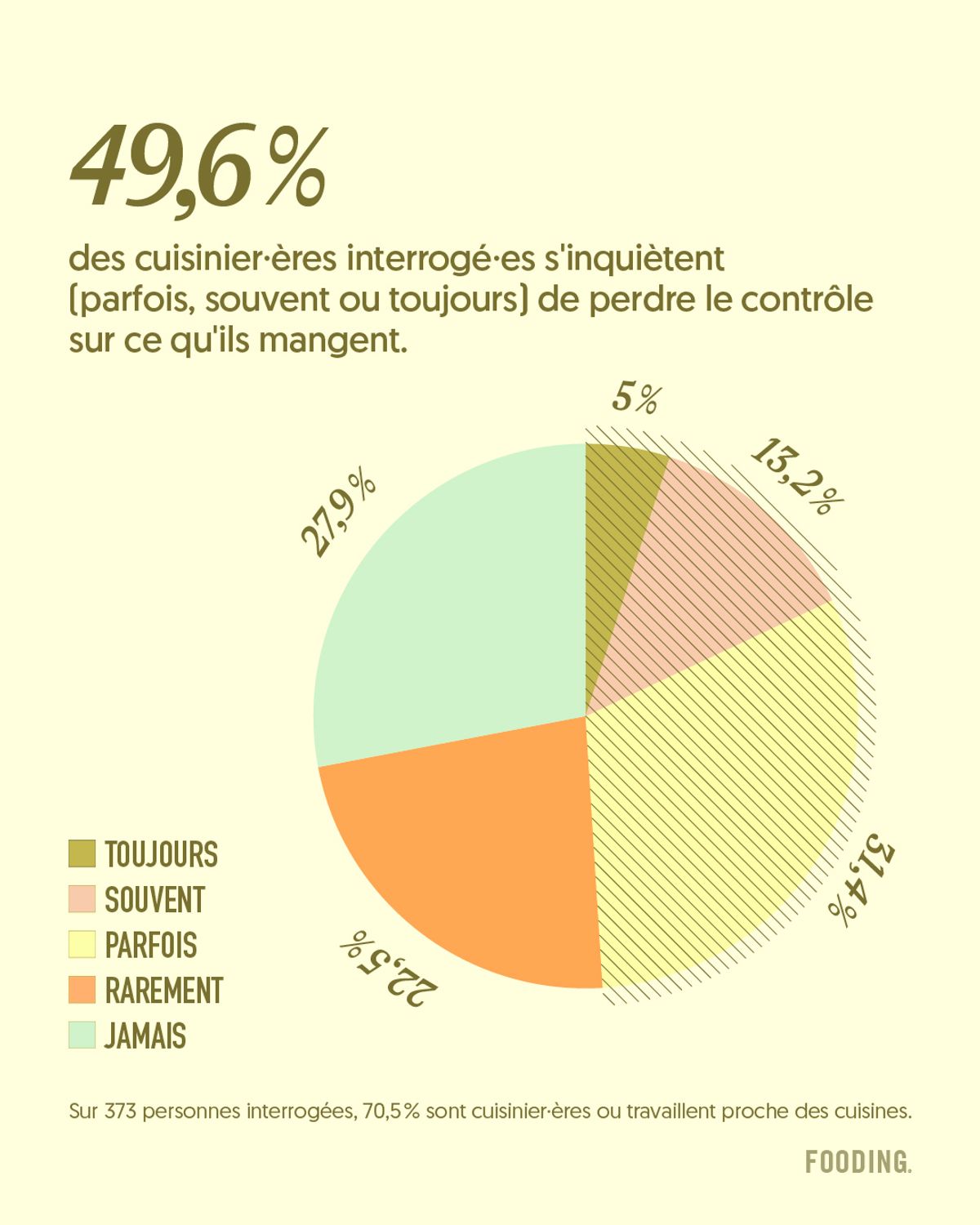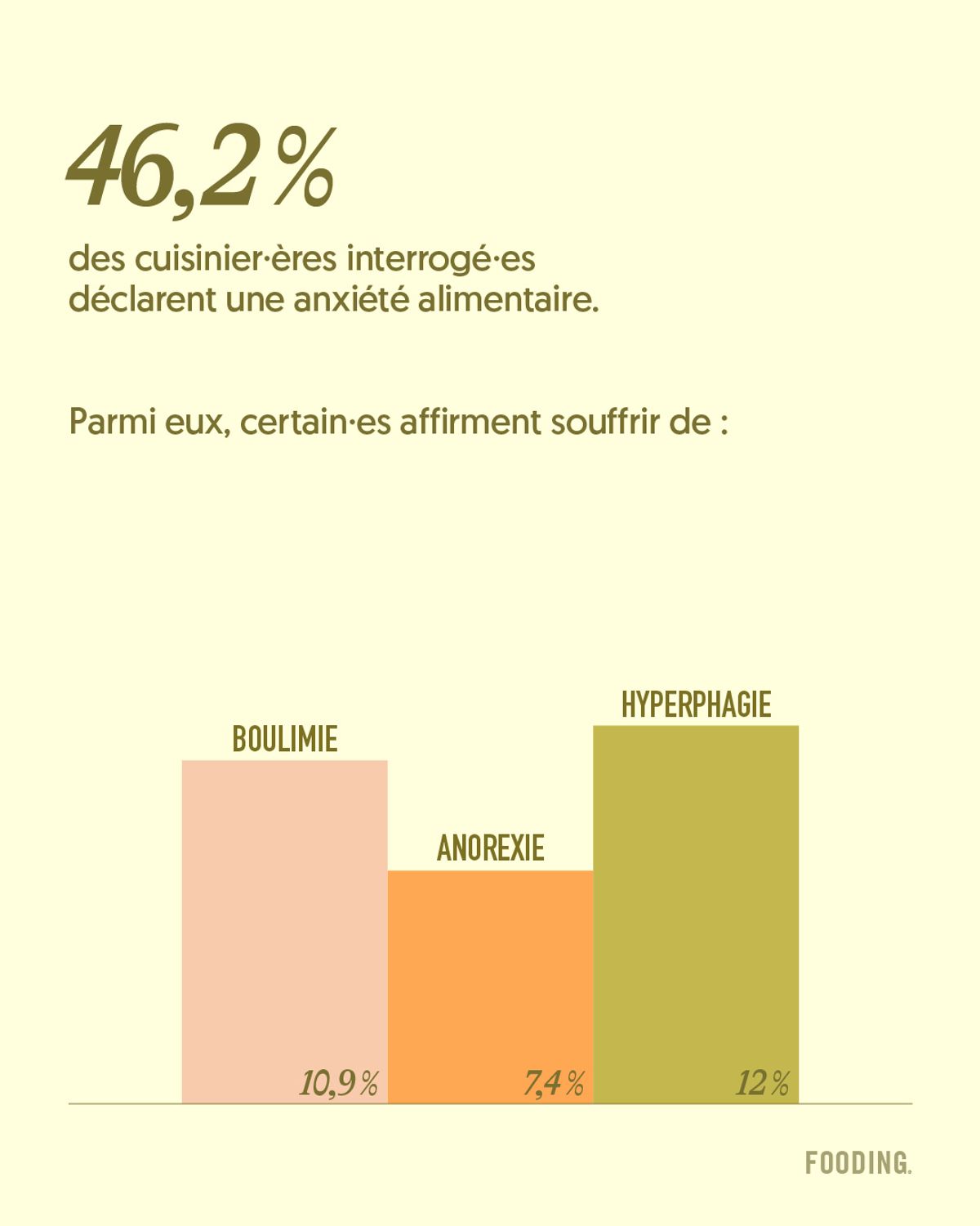 En l’espace de quelques jours, notre appel à témoignages a recueilli 373 réponses de la profession : des artisan·es et des commerçant·es de bouche, des agriculteur·rices, des travailleur·ses des médias en lien avec la food, mais en grande majorité (70,5 %), des personnes travaillant en cuisine ou qui en sont proches. Et parmi eux, près d’un·e cuisinier·ère sur deux déclarant souffrir d’anxiété alimentaire, soit le moment où l’alimentation devient une source de préoccupation excessive, chronique, avec des répercussions sur la vie et la santé mentale et physique de l’individu – un spectre plus large que celui des troubles des conduites alimentaires, aussi appelés TCA.