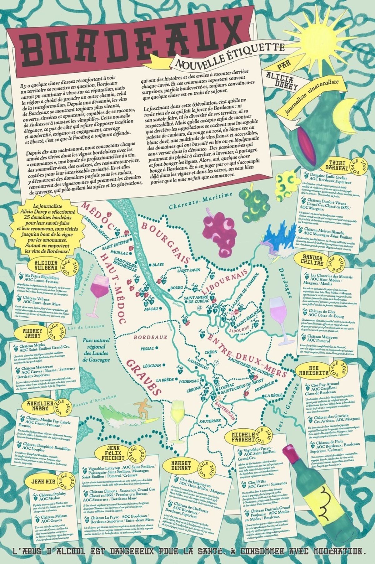 Des pieds de vigne aux verres à pied, le temps passe vite ! Depuis 10 ans maintenant, le Fooding et les Vins de Bordeaux organisent des virées dans les vignes bordelaises avec les « œnonautes », une bande de professionnel·les du vin, des sommelier·ères, des cavistes, des restaurateur·rices, casté·es pour leur intarissable curiosité. Ils et elles y découvrent des domaines parfois sous les radars, et rencontrent des vigneron·nes qui prennent les chemins de traverse, pêle-mêlent les styles et les générations, avec des histoires et des envies à raconter derrière chaque cuvée… dont certaines sont livrées ici, pour vos beaux yeux et la postérité.