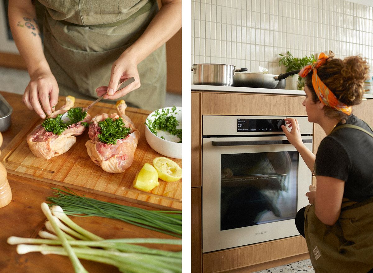 Mettre le poulet dans un sac sous vide et l’enfourner dans le Bespoke de Samsung pour 3 heures à 73 °C.