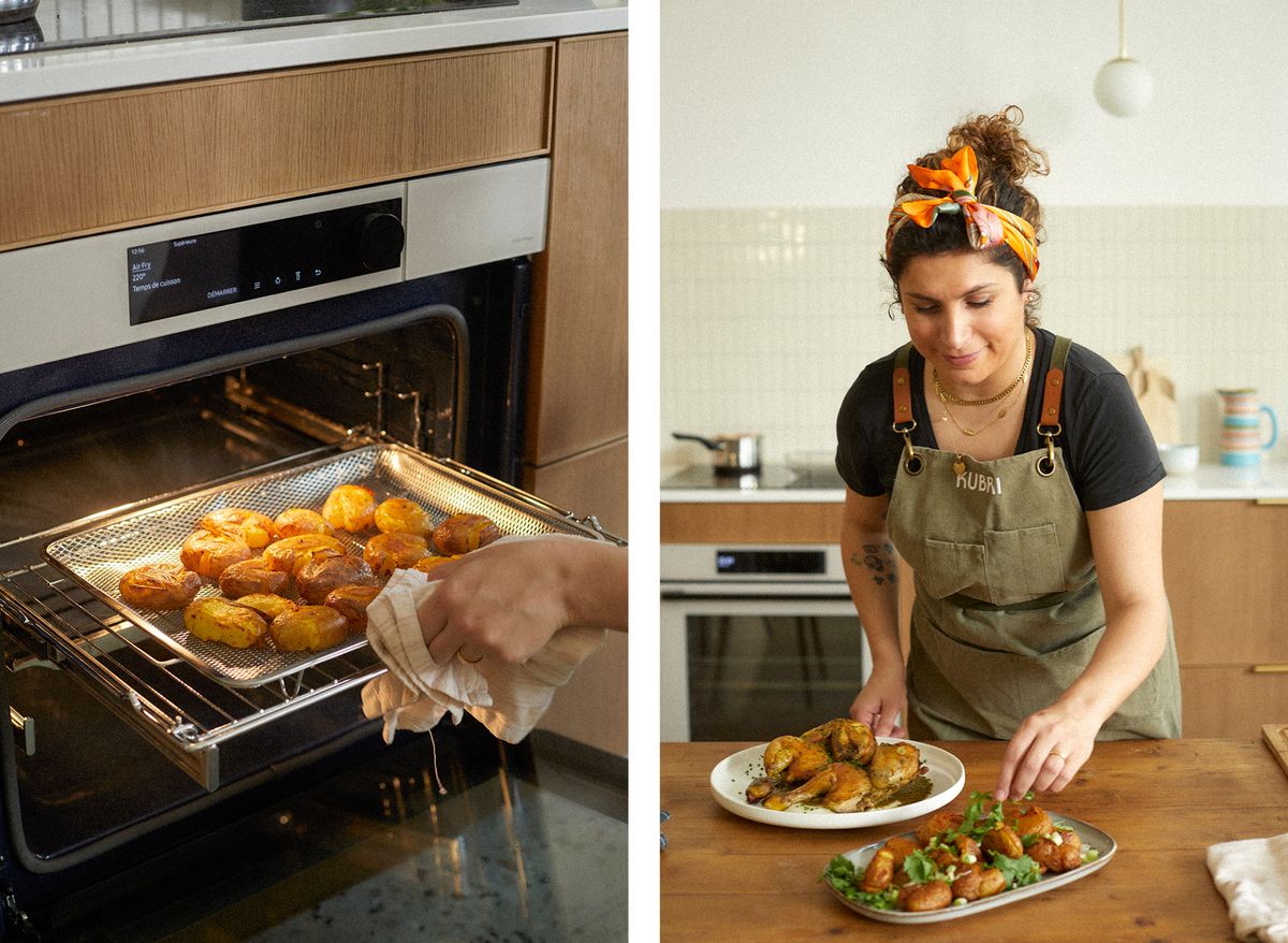 Les couverts s’entrechoquent, les verres se remplissent, les langues se délient… L’entrée d’asperges blanches a mis votre tablée en appétit ? Avec le poulet rôti de Rita Higgins, c’est du tout cuit ! Grâce à la cuisson sous vide en basse température du four Bespoke de Samsung, qui préserve toutes les saveurs et qualités nutritionnelles de la viande, vous aurez de quoi régaler haut la faim en suivant la recette de la cheffe du resto Kubri. Acoquiné à des grenailles épicées et un toum libanais qui fait boum, votre poulet rôti n’aura jamais été aussi sexy !